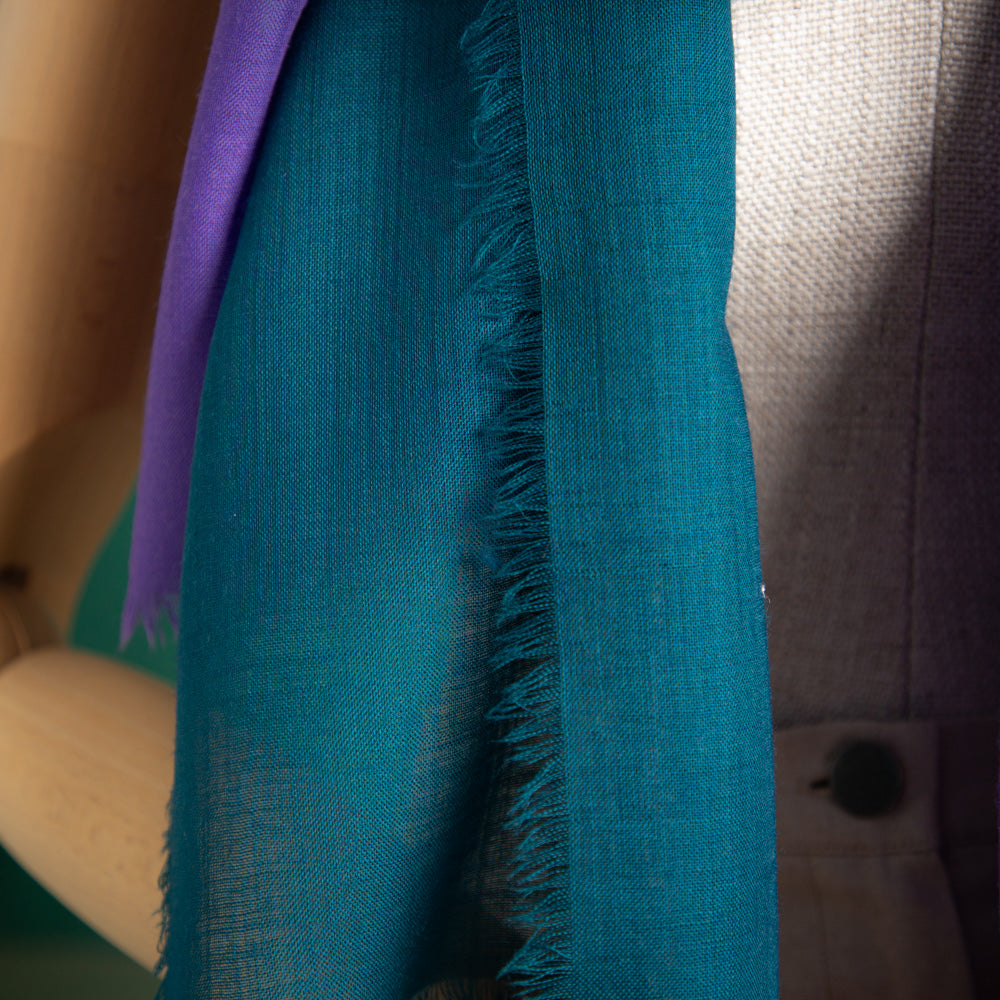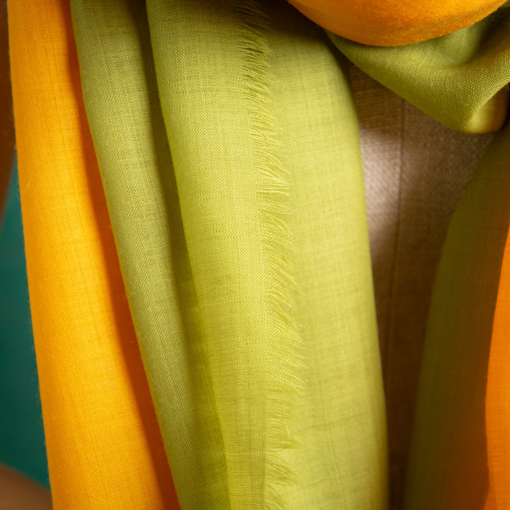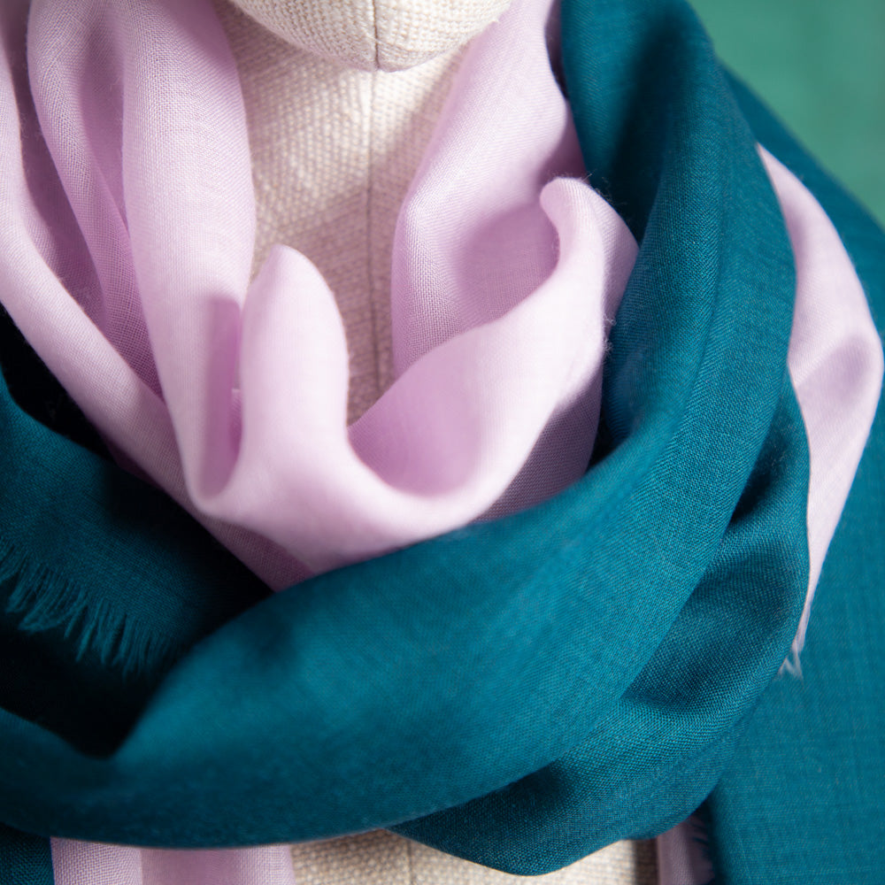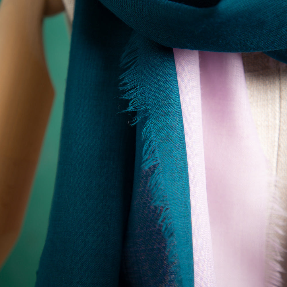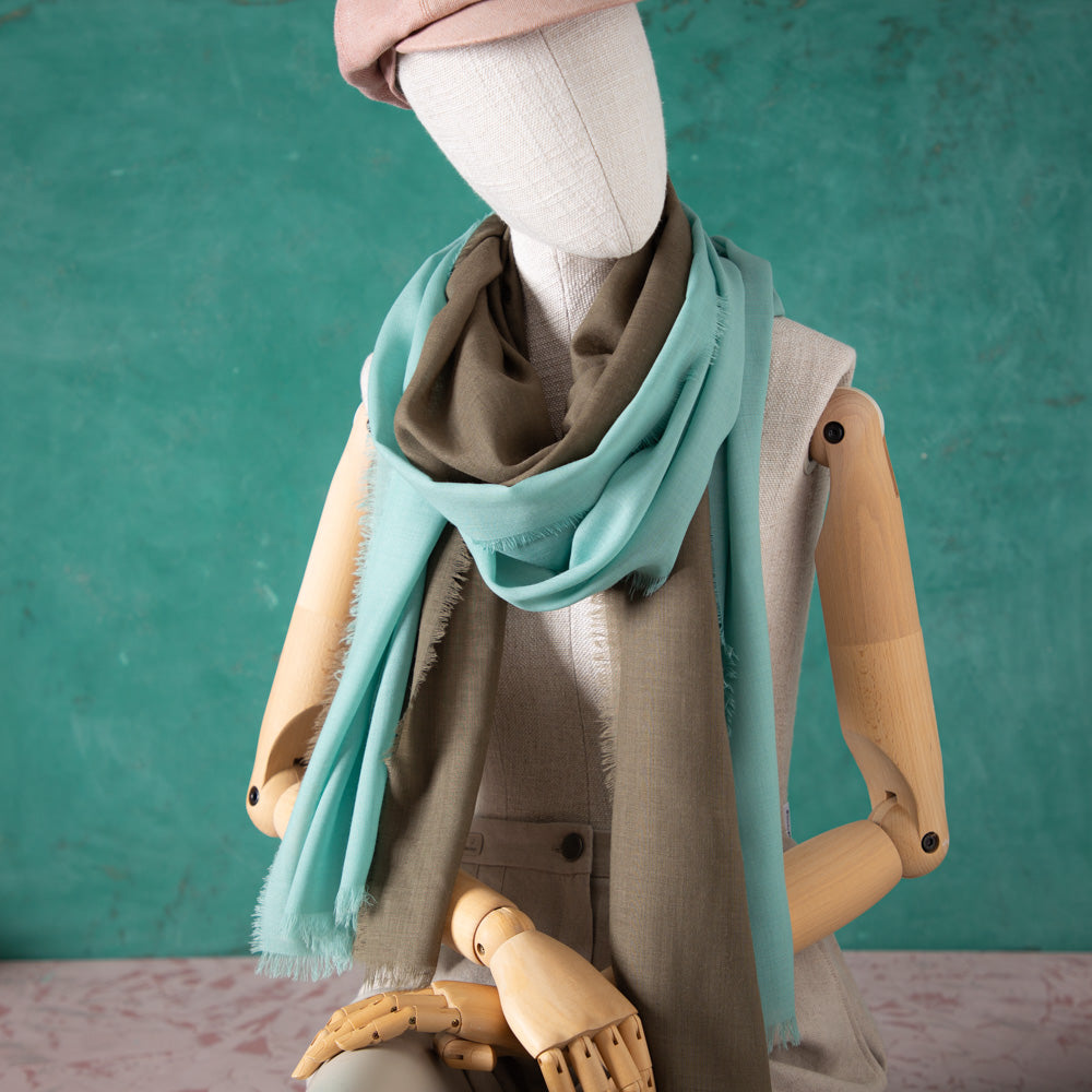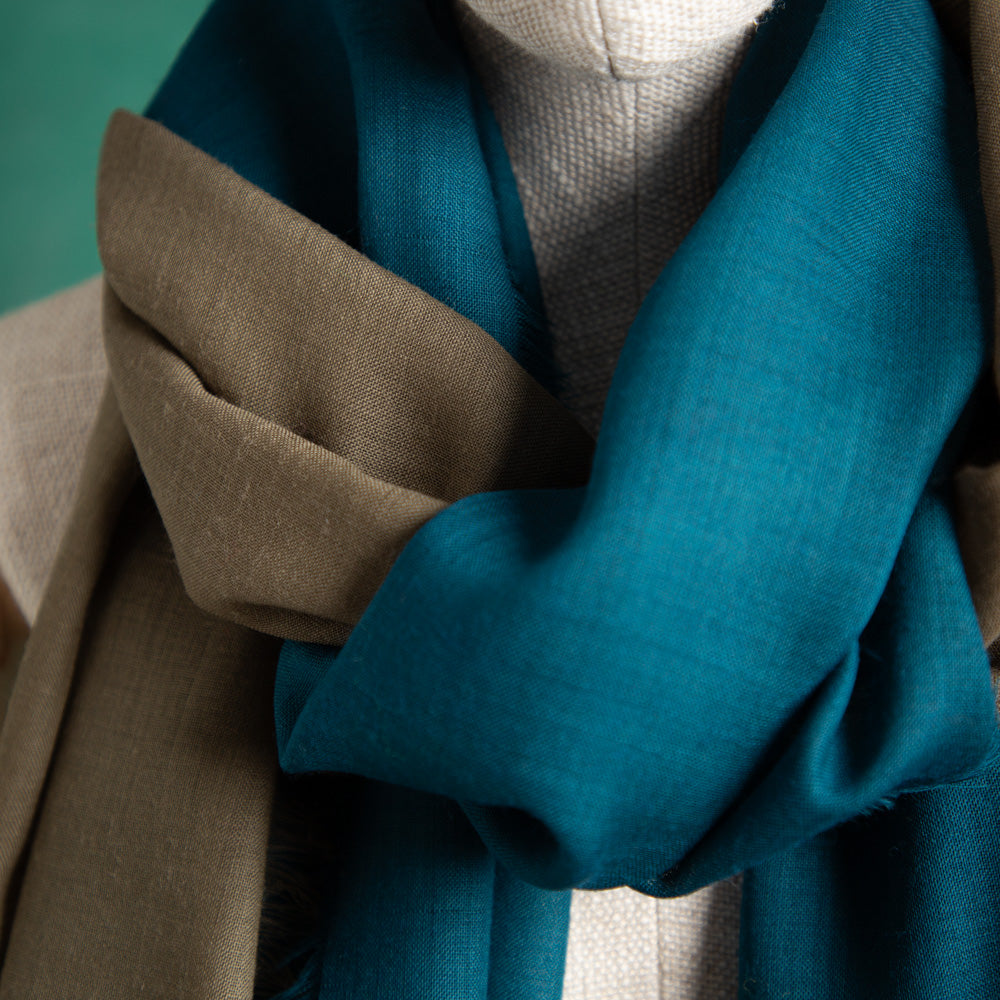 Einzeln getragen ist der Wollschal ideal für milde Temperaturen oder Innenräume – leicht, unbeschwert und trotzdem wärmend.
