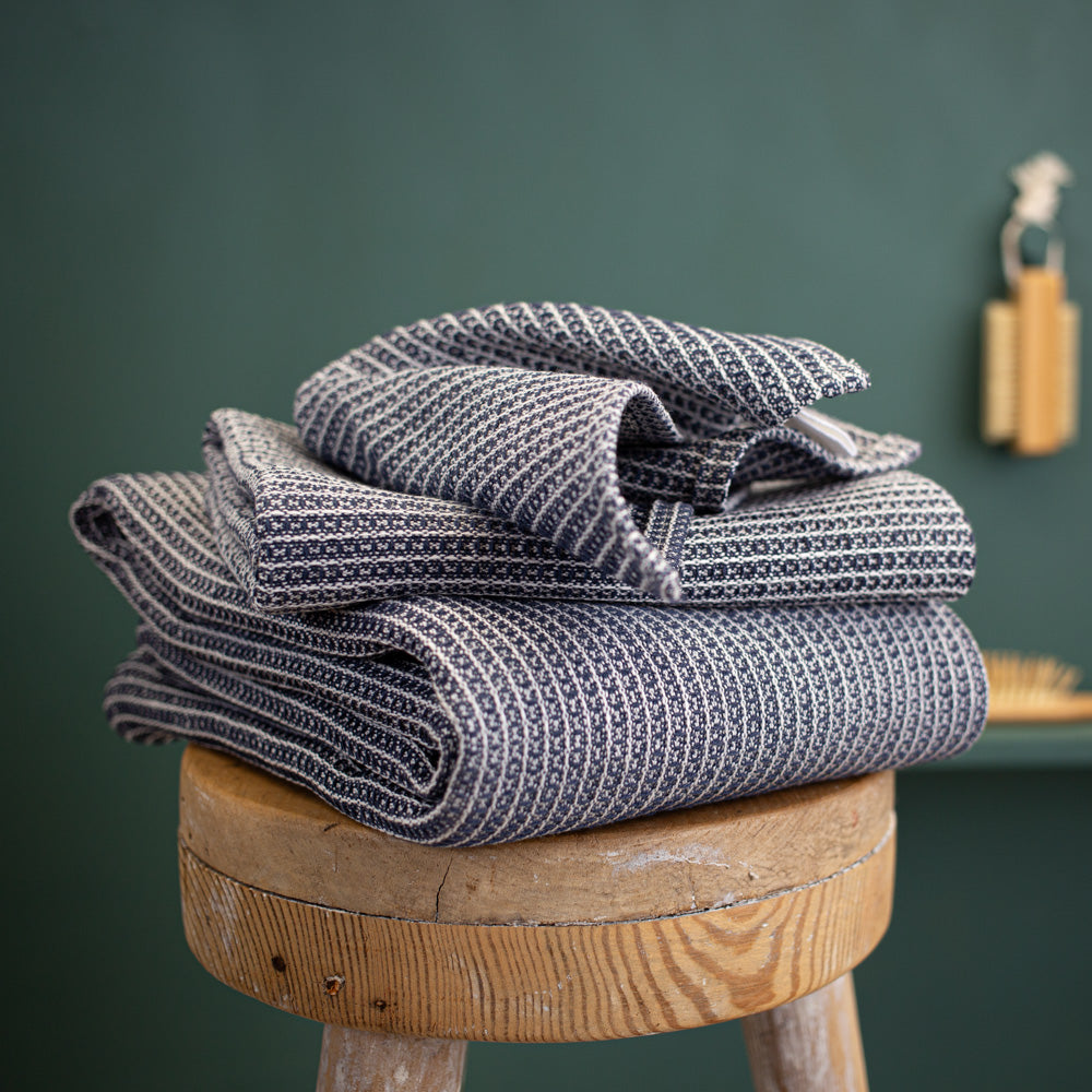 Der Stoff wird in einer österreichischen Traditionsweberei gewebt, die auf hochwertige Leinengewebe spezialisiert ist. Die Konfektion der Tücher erfolgt in unserem Atelier in Schleswig-Holstein. Alle Formate – vom Waschlappen bis zum großzügigen Badetuch – entstehen mit Sorgfalt und einem tiefen Bewusstsein für Qualität, Herkunft und Nachhaltigkeit.
