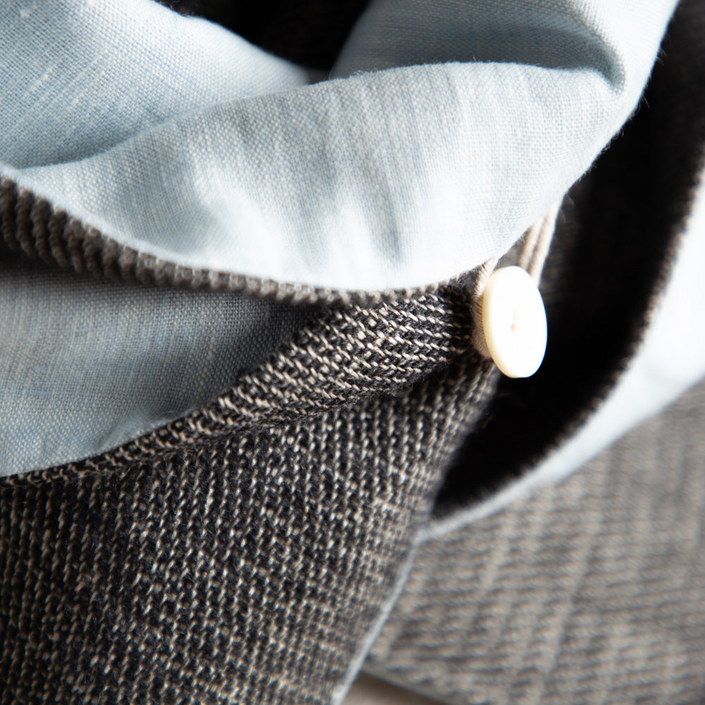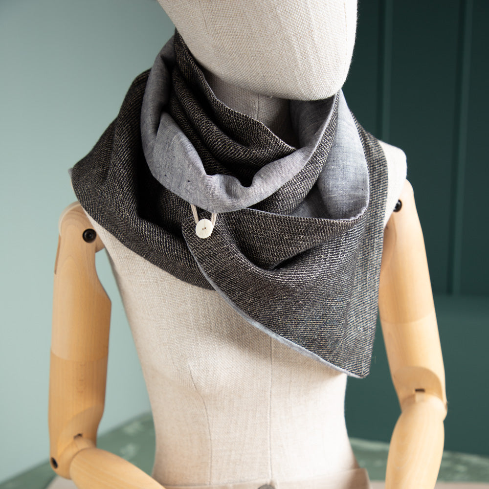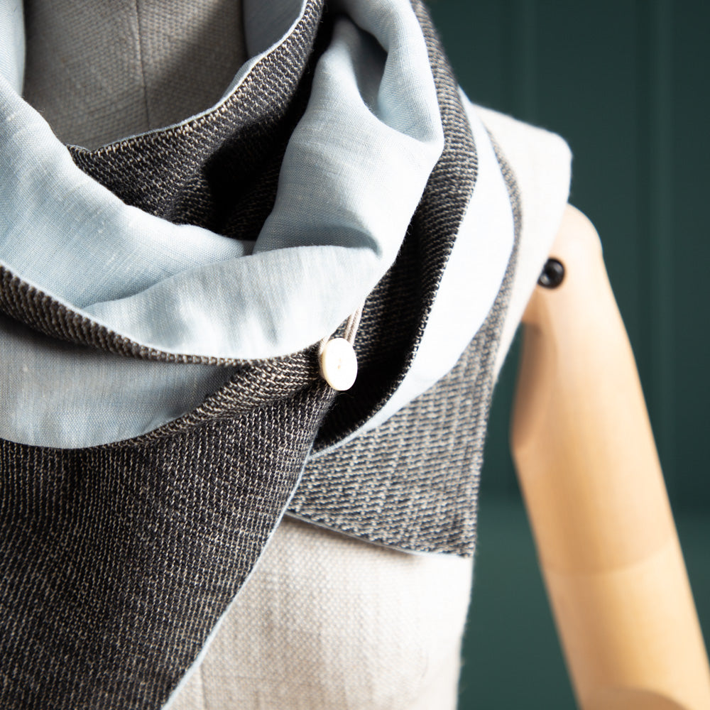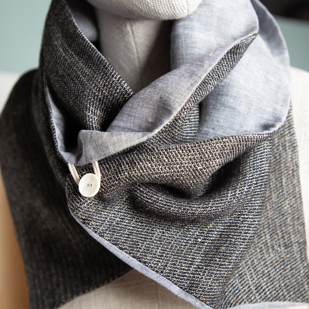 Dieser zweilagige Schal verbindet die Wärme eines Wolle-Leinen-Gemischs mit der weich abgefütterten Innenseite aus reinem Leinen. Durch die zweifarbige Gestaltung wirkt er nicht nur dekorativ – er trägt sich wie ein kleines Kleidungsstück, das deinen Stil sofort aufwertet.
