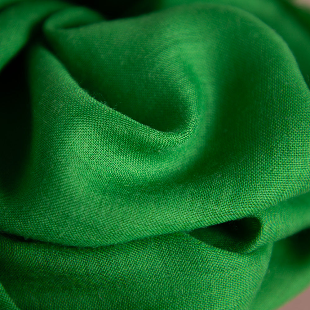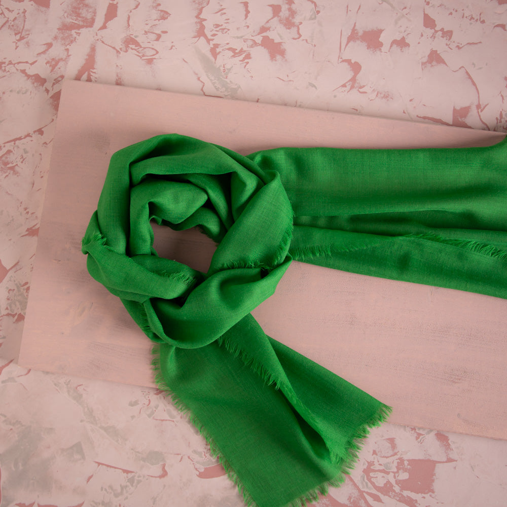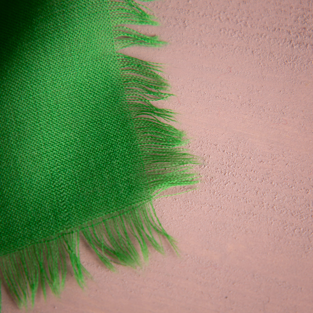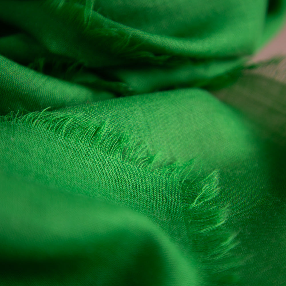 Jedes Tuch wird aus besonders dünn ausgesponnener Bio-Merino-Wolle gefertigt – so fein, dass es leicht transparent wirkt und gleichzeitig atmungsaktiv bleibt. Durch den bewussten Verzicht auf Nähte bleibt das Gewebe unversehrt und fällt besonders weich. Die weichen Fransen an den Rändern sorgen für lässige Eleganz.