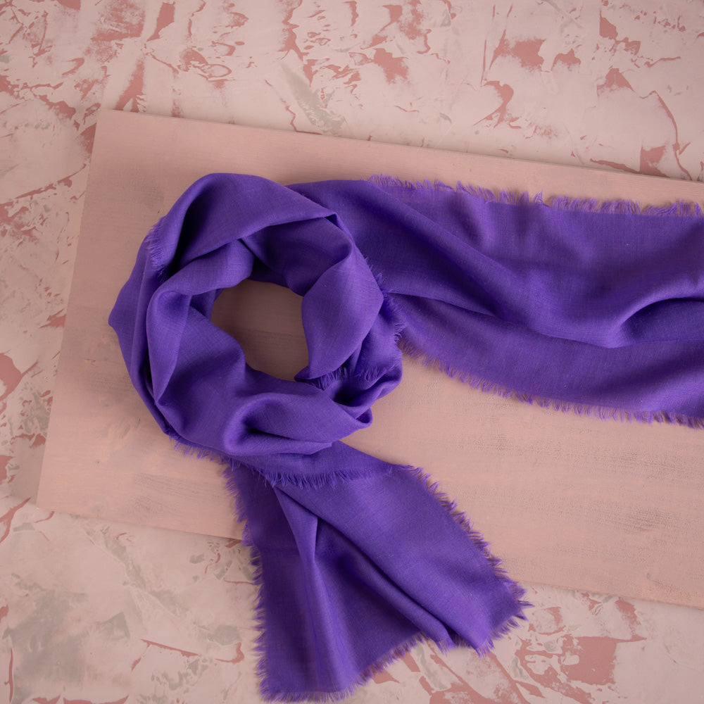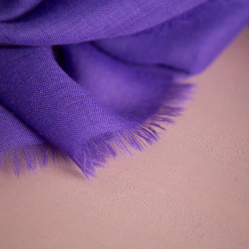 Jedes Tuch wird aus besonders dünn ausgesponnener Bio-Merino-Wolle gefertigt – so fein, dass es leicht transparent wirkt und gleichzeitig atmungsaktiv bleibt. Durch den bewussten Verzicht auf Nähte bleibt das Gewebe unversehrt und fällt besonders weich. Die weichen Fransen an den Rändern sorgen für lässige Eleganz.