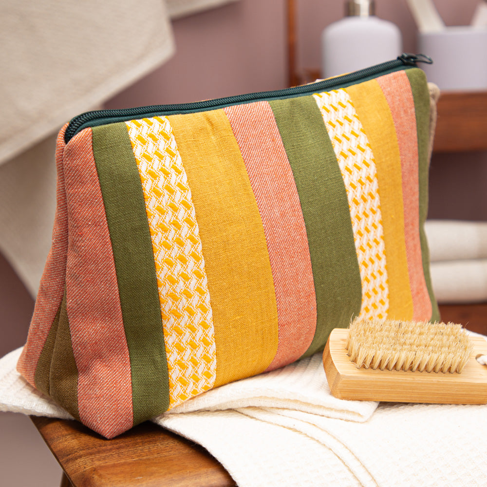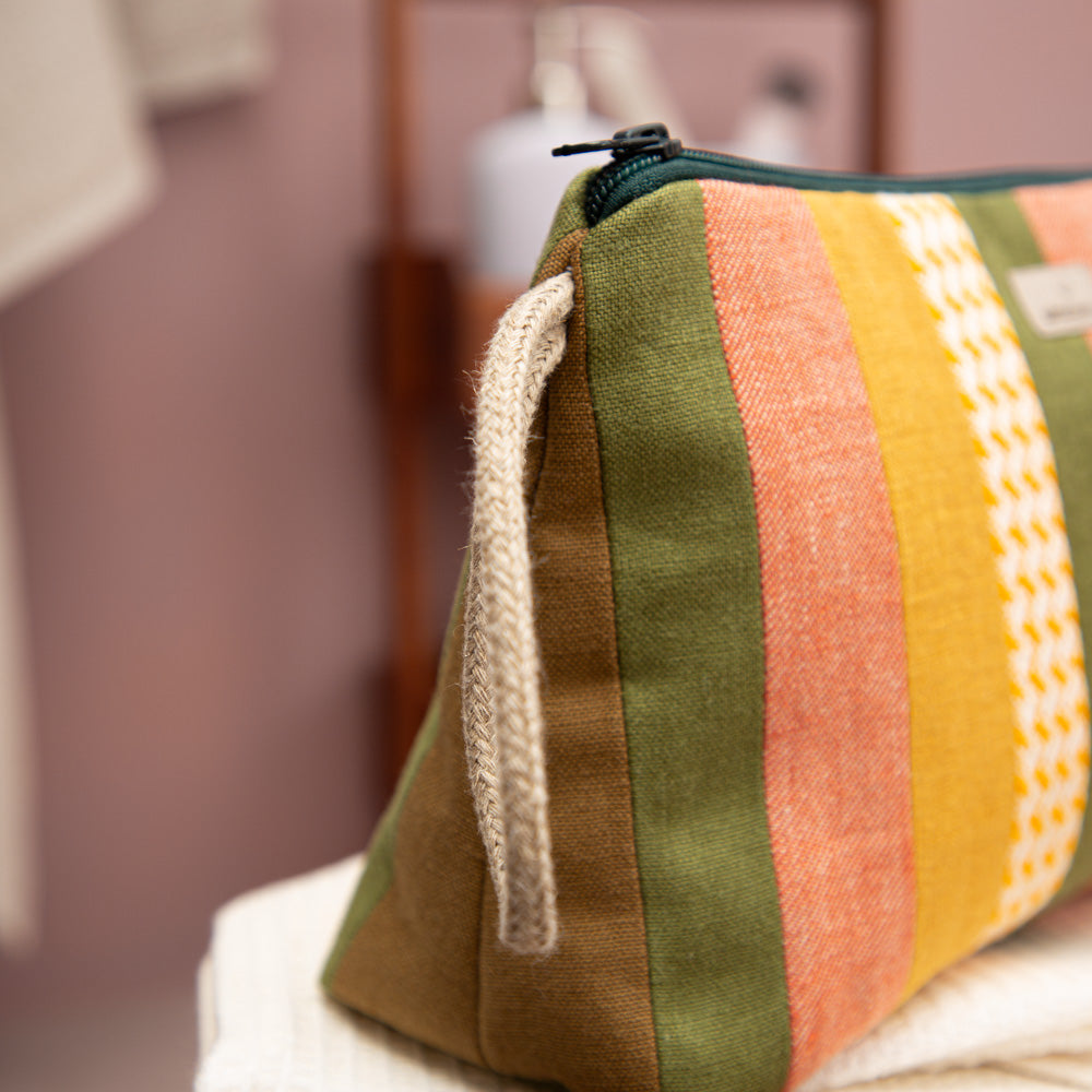 Unsere Kulturtaschen sind Unikate – jedes Stück ist ein kleines Kunstwerk aus unserer Zero-Waste-Kollektion. Sie sind waschbar, benötigen keine Plastikbeschichtung und sind somit perfekt geeignet für alle, die Wert auf Nachhaltigkeit legen. Kombiniere sie mit unseren Bio-Leinen-Seifensäckchen oder Kosmetiktaschen für eine noch bessere Organisation deiner Utensilien.