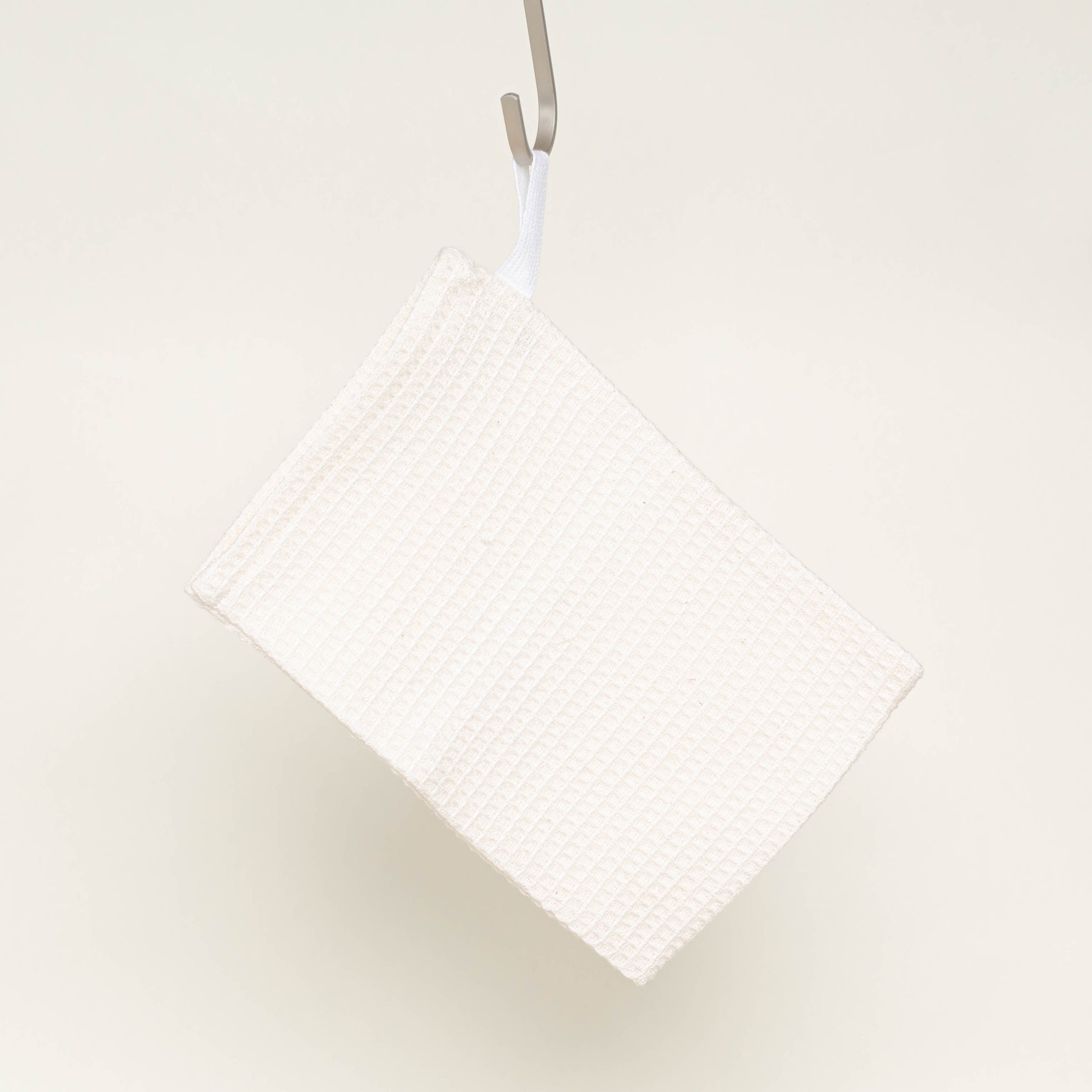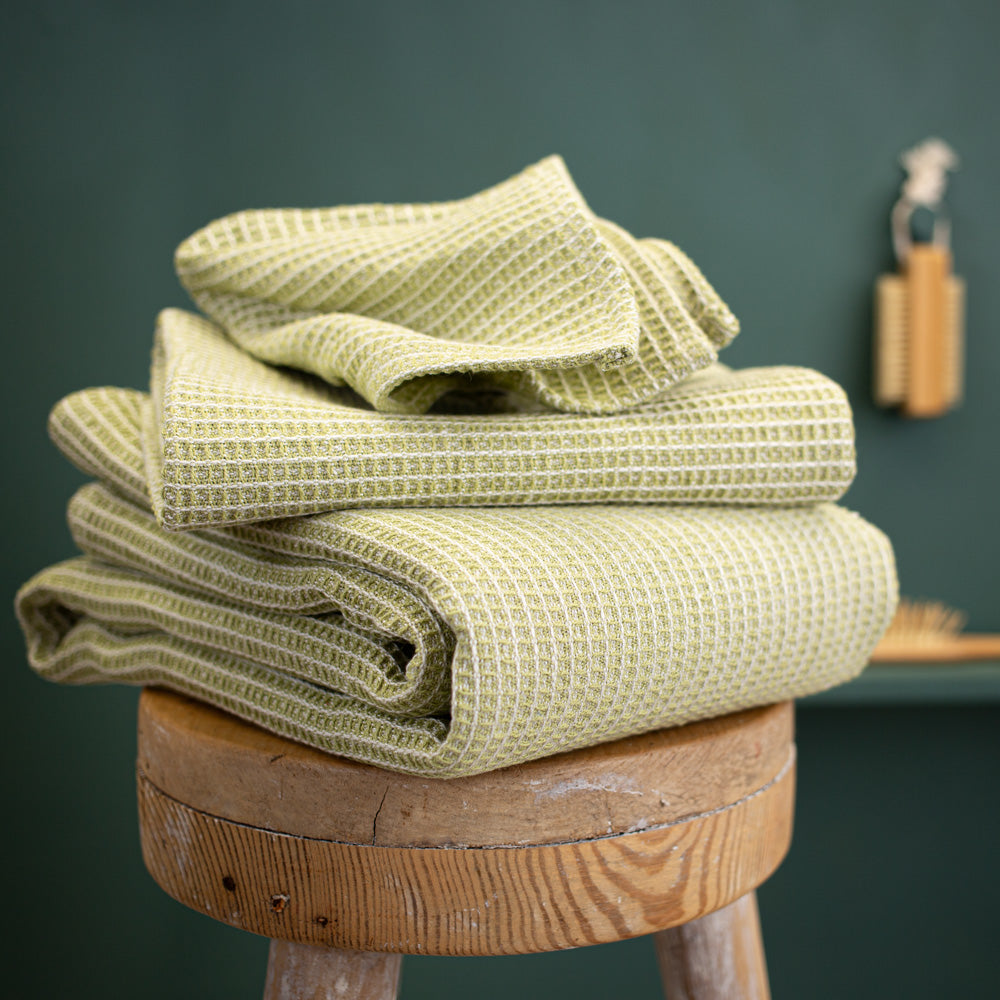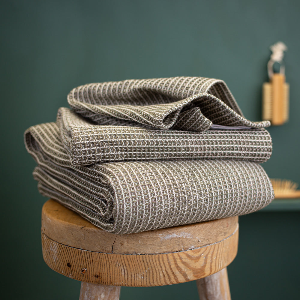 Handgefertigte Badtextilien aus Halbleinen-Waffelpikee – plastikfrei, funktional und stilvoll.