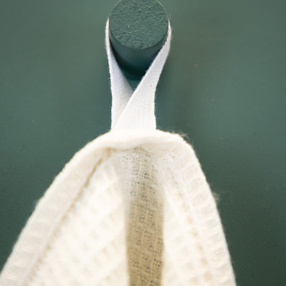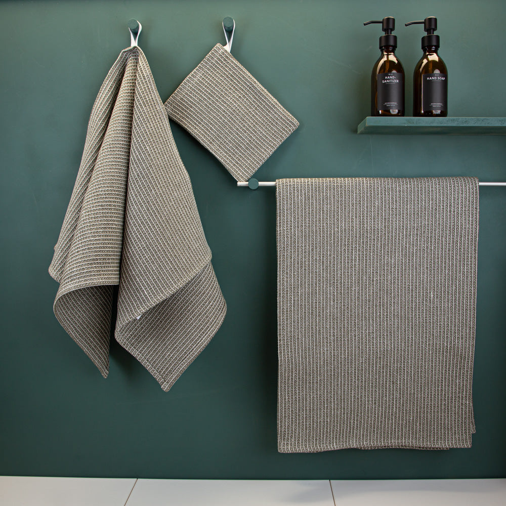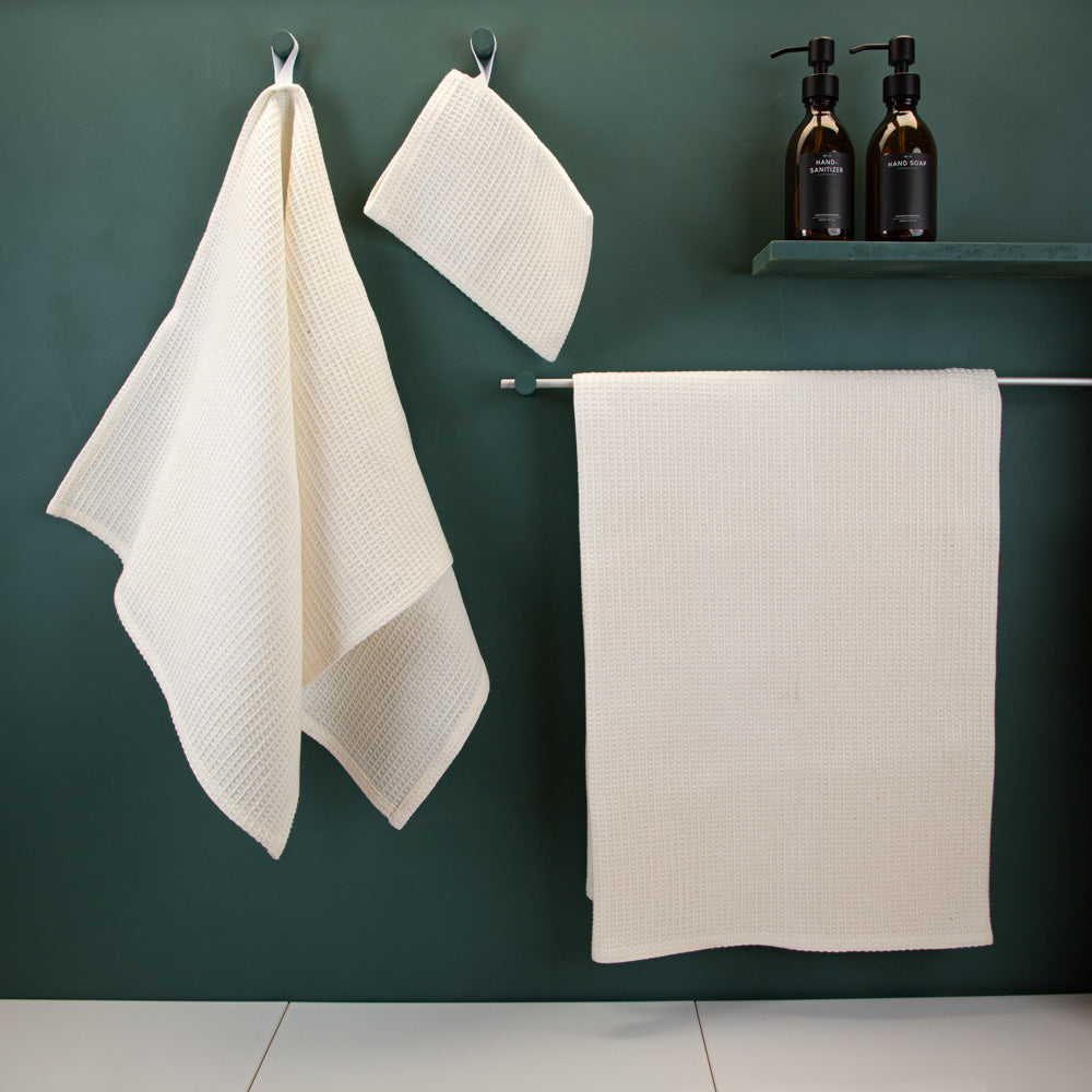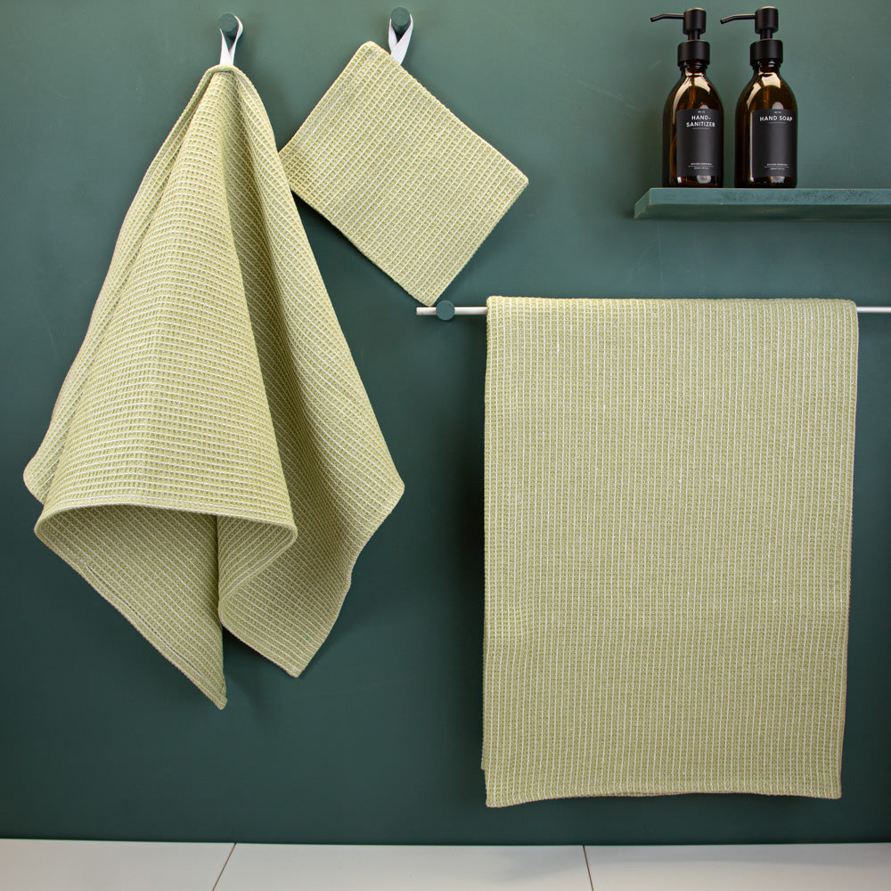 Handgefertigte Badtextilien aus Halbleinen-Waffelpikee – plastikfrei, funktional und stilvoll.